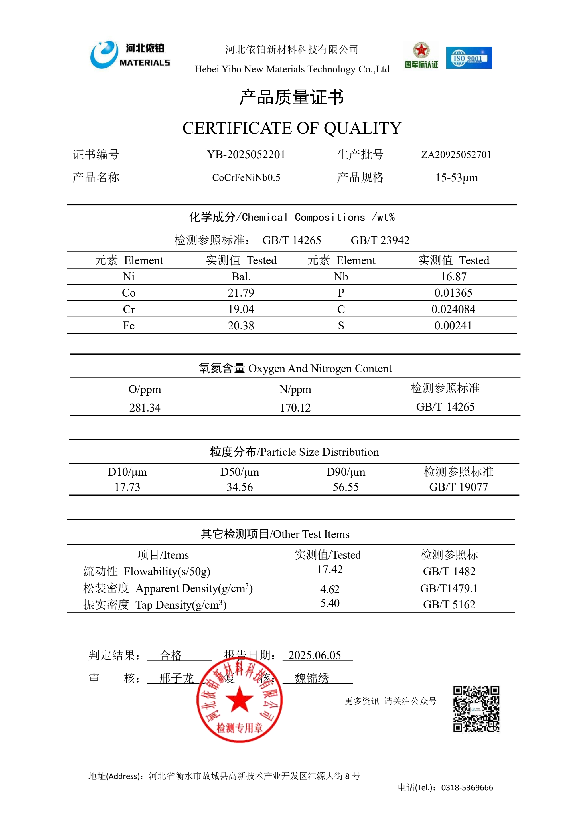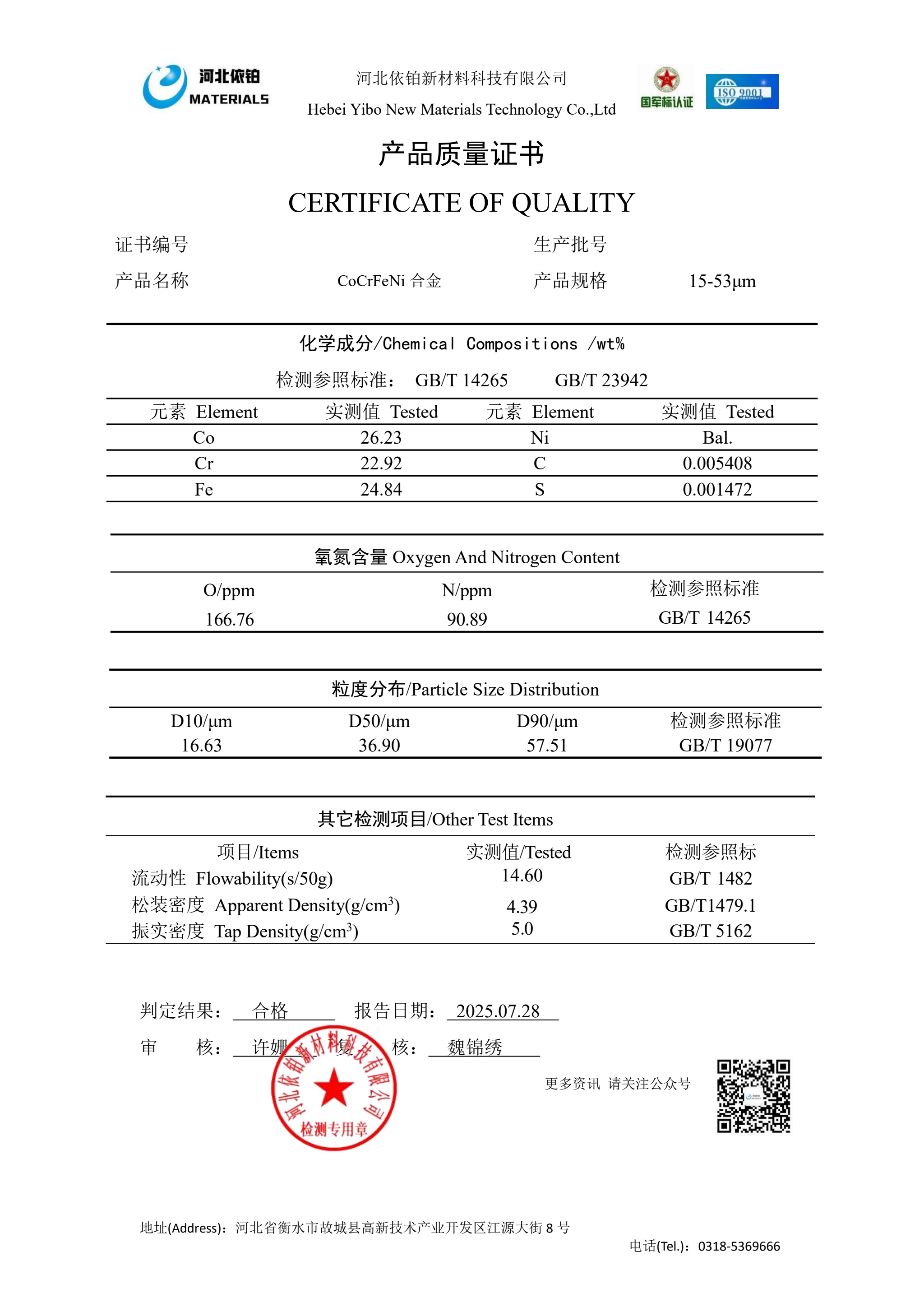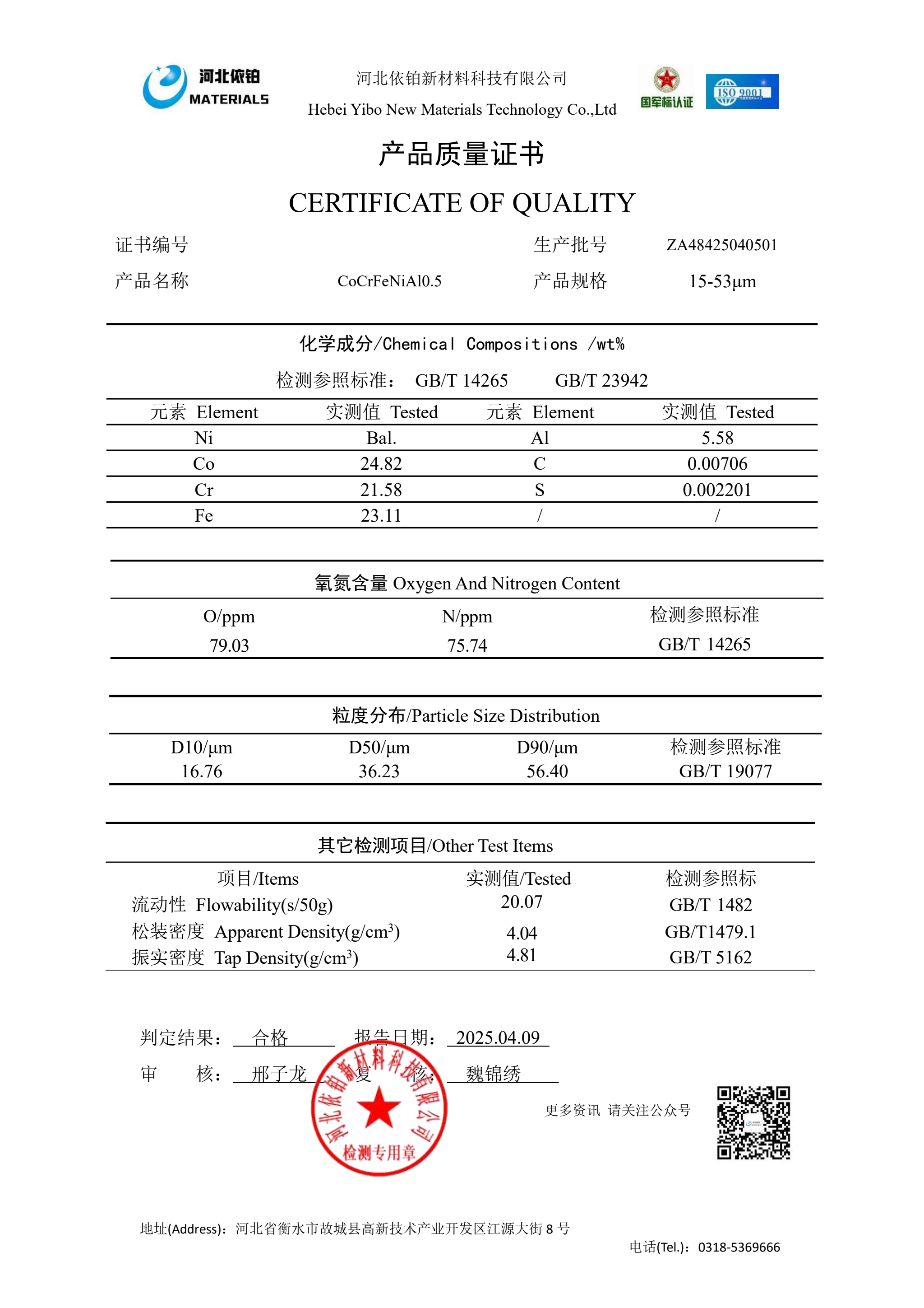 CoCrFeNi合金是一种高熵合金,具有较好的强塑性配合、优秀的耐腐蚀性能、高温抗氧化性能和耐磨性能等,在多个高端制造领域具有广泛的应用前景。并且CoCrFeNi高熵合金体系具有广阔的设计空间、可以通过添加不同元素来调控性能。添加Si元素能够同时提高合金的强度、塑性和耐腐蚀性能、添加Mo、Ti、Nb等元素可以形成析出相强化,显著提高合金的强度。尤其是3D打印技术的日臻完善为合金的应用增加了潜在的应用前景。因此,CoCrFeNi合金粉末在增材制造、表面涂层、航空航天、能源、医疗、模具等领域得到了广泛应用。目前,河北依铂新材料科技有限公司对CoCrFeNi合金粉未制取技术有比较成熟的经验,可以稳定生产出符合3D打印需求和高端领域应用的CoCrFeNi粉末以及相关产品,例如:CoCrFeNiMn、CoCrFeNiAlx、CoCrFeNiNb0.5、CoCrFeNiTi、CoCrFeNiSi、CoCrFeNiSiAl、CoCrFeNiAlTi等,并通过销售至客户,已经成功应用于航空航天、医疗、3D打印等诸多领域,得到了应用商的一致好评。