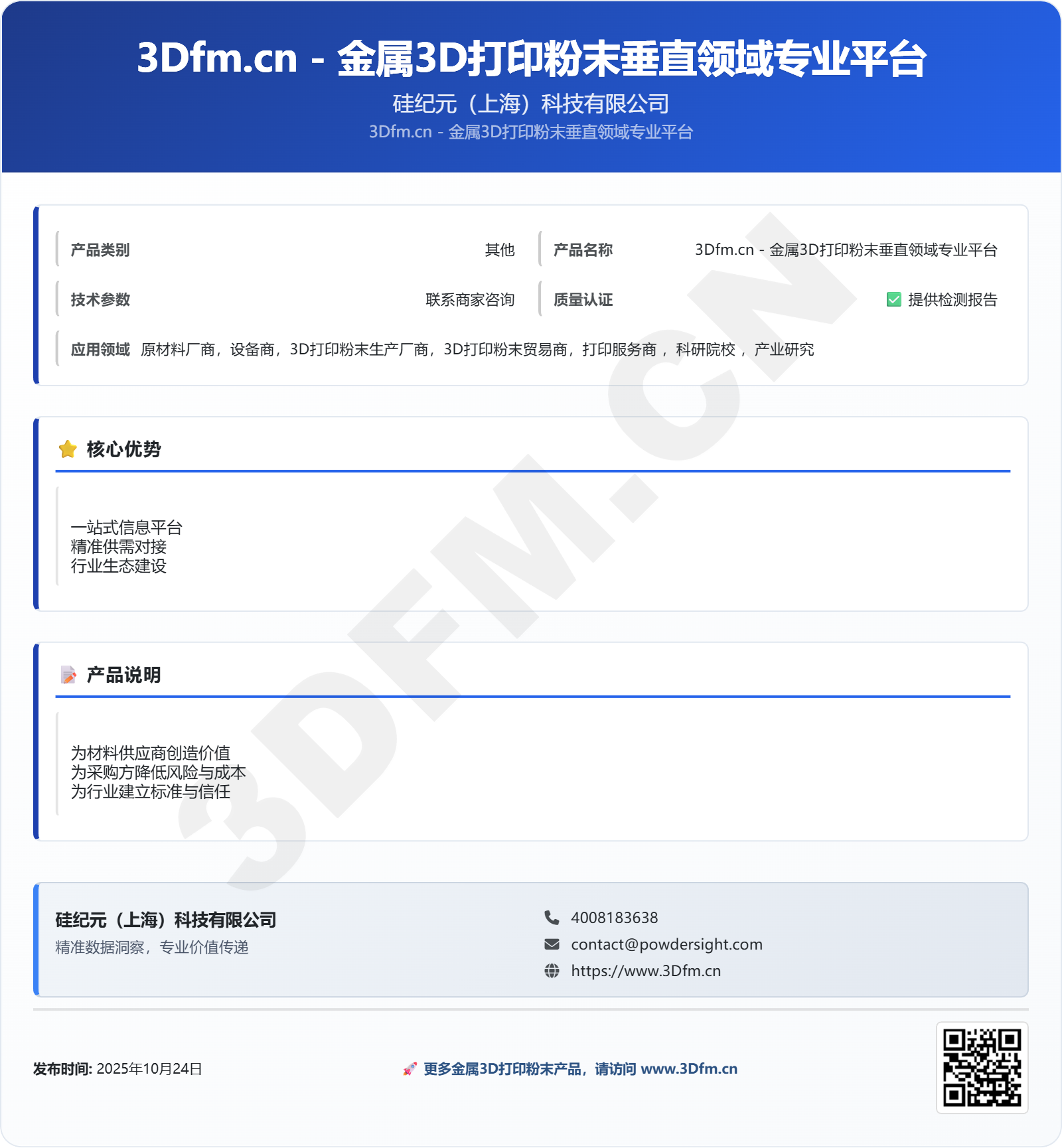 PowderSight致力于打造金属3D打印粉末垂直领域专业平台,解决材料端核心痛点,推动中国金属3D打印粉末材料的国产化、标准化与产业化进程,构建值得信赖的行业基础设施,助力中国增材制造产业实现高质量可持续发展。通过资源整合与技术创新,致力于成为金属3D打印粉末领域最具影响力的专业服务平台之一。